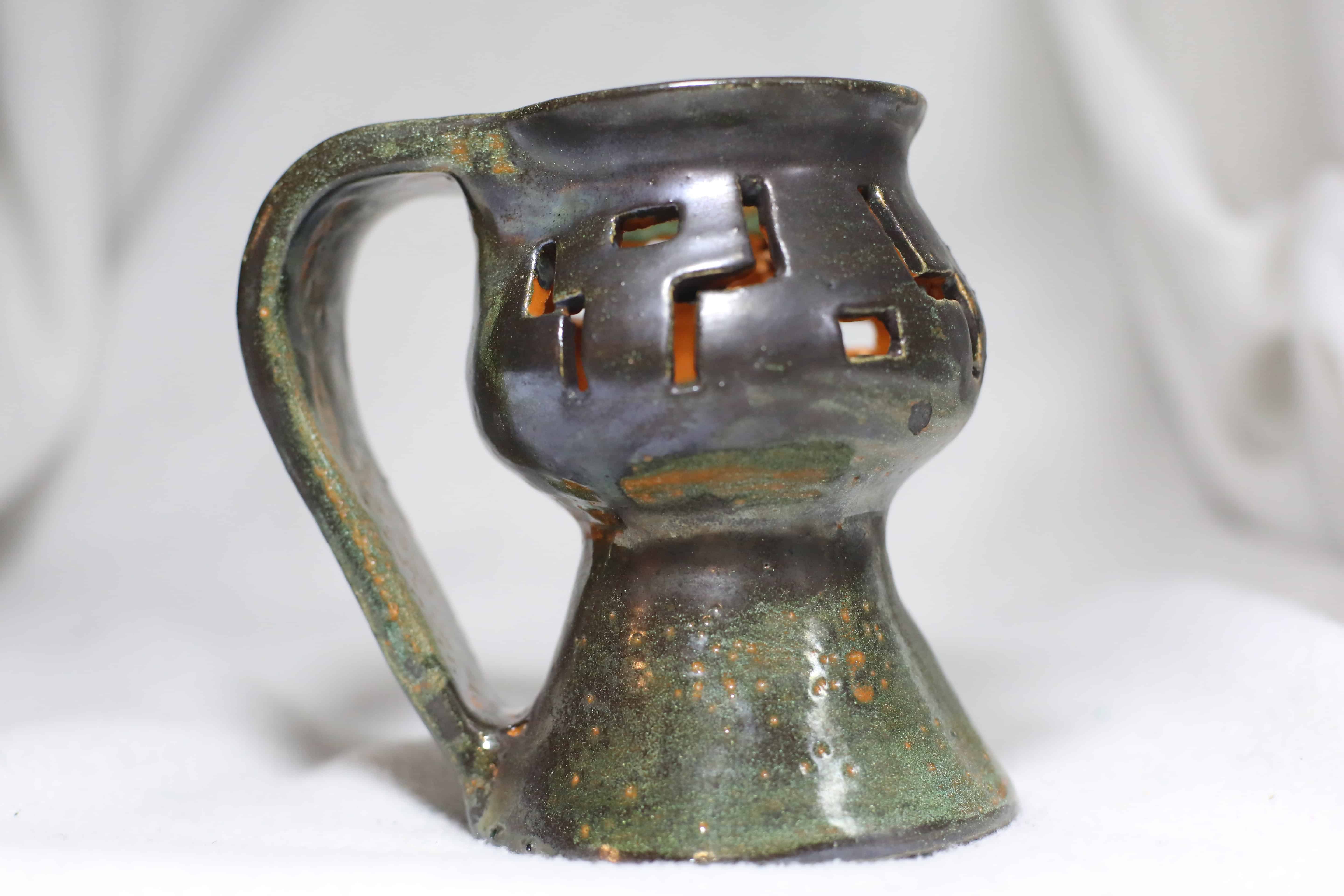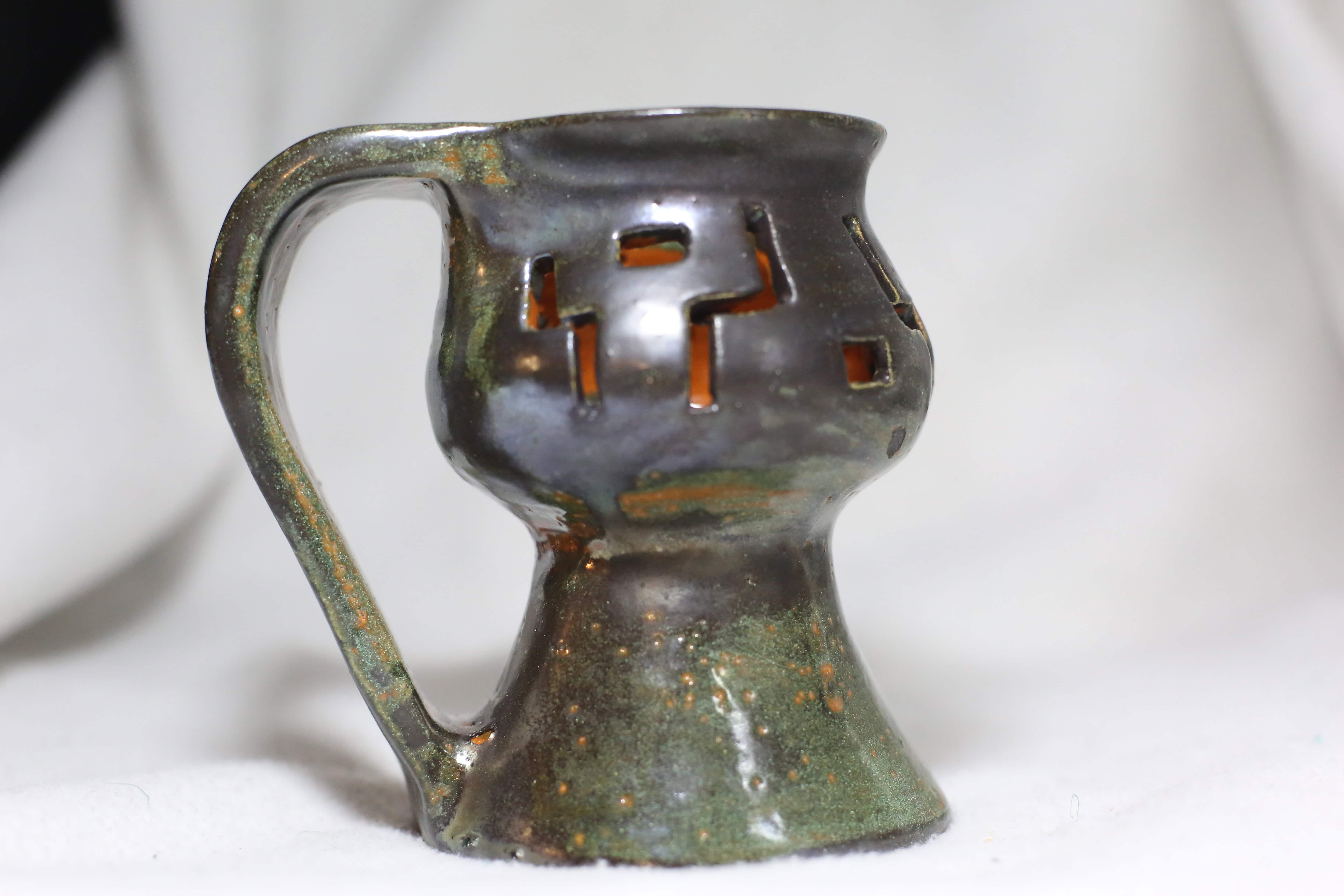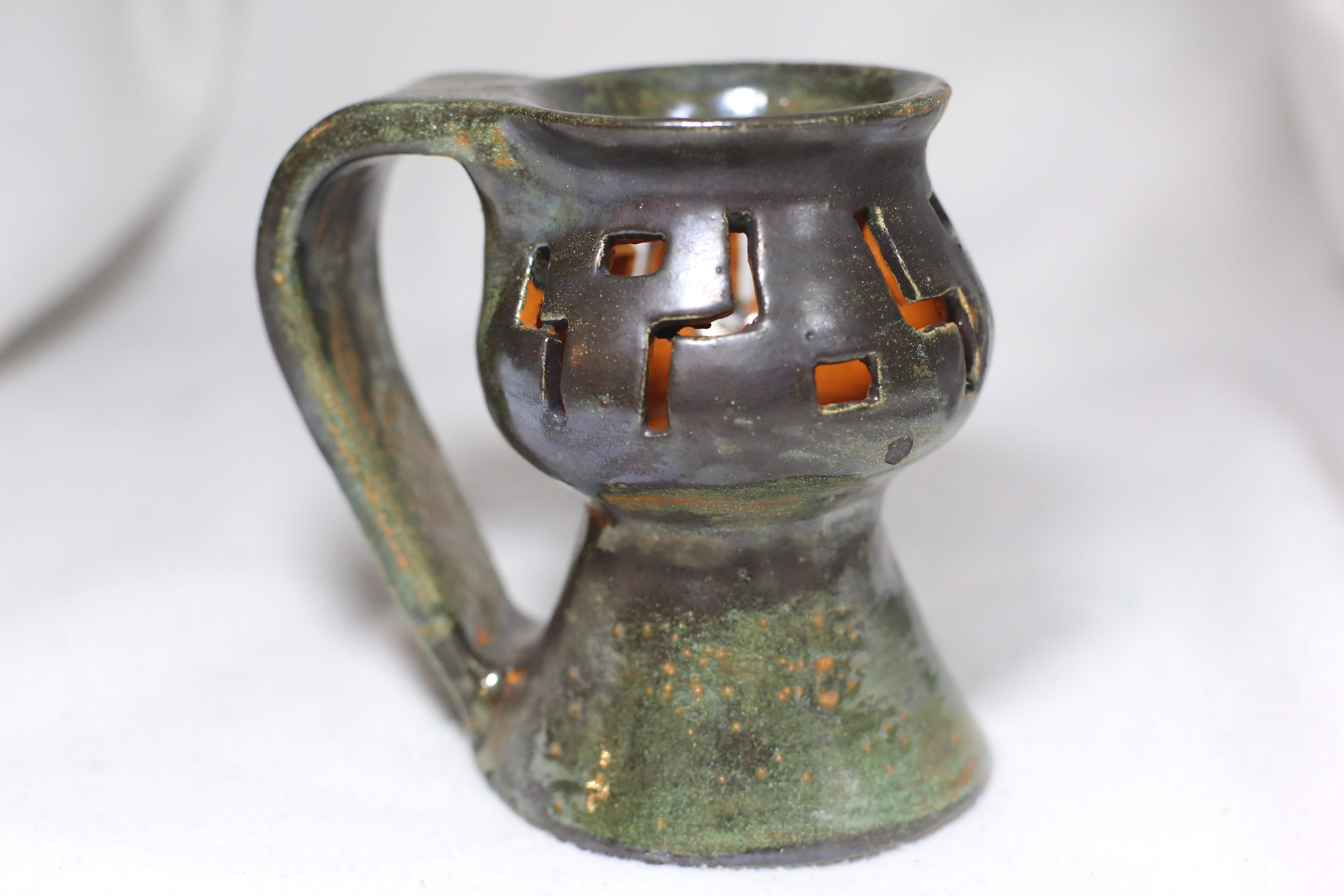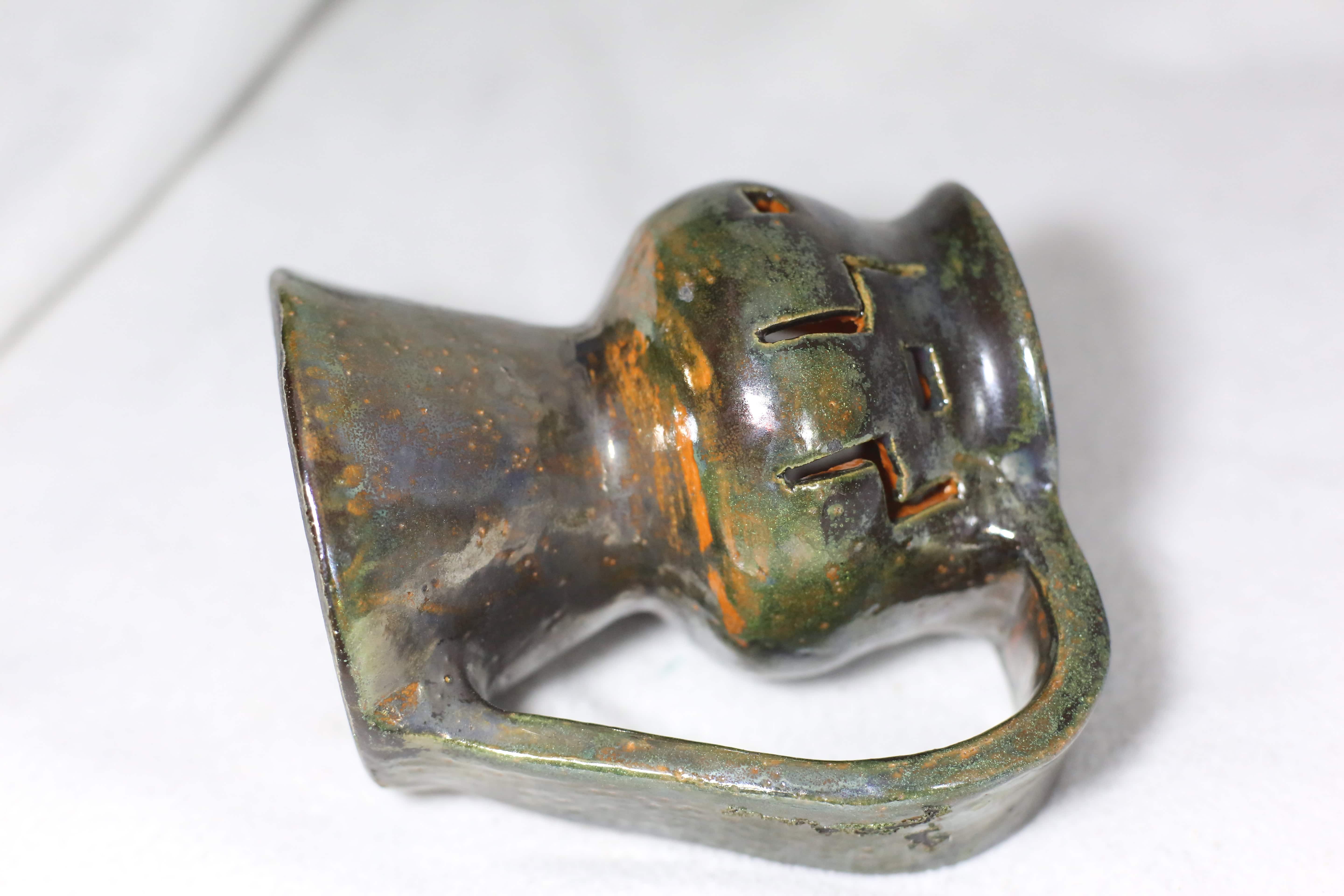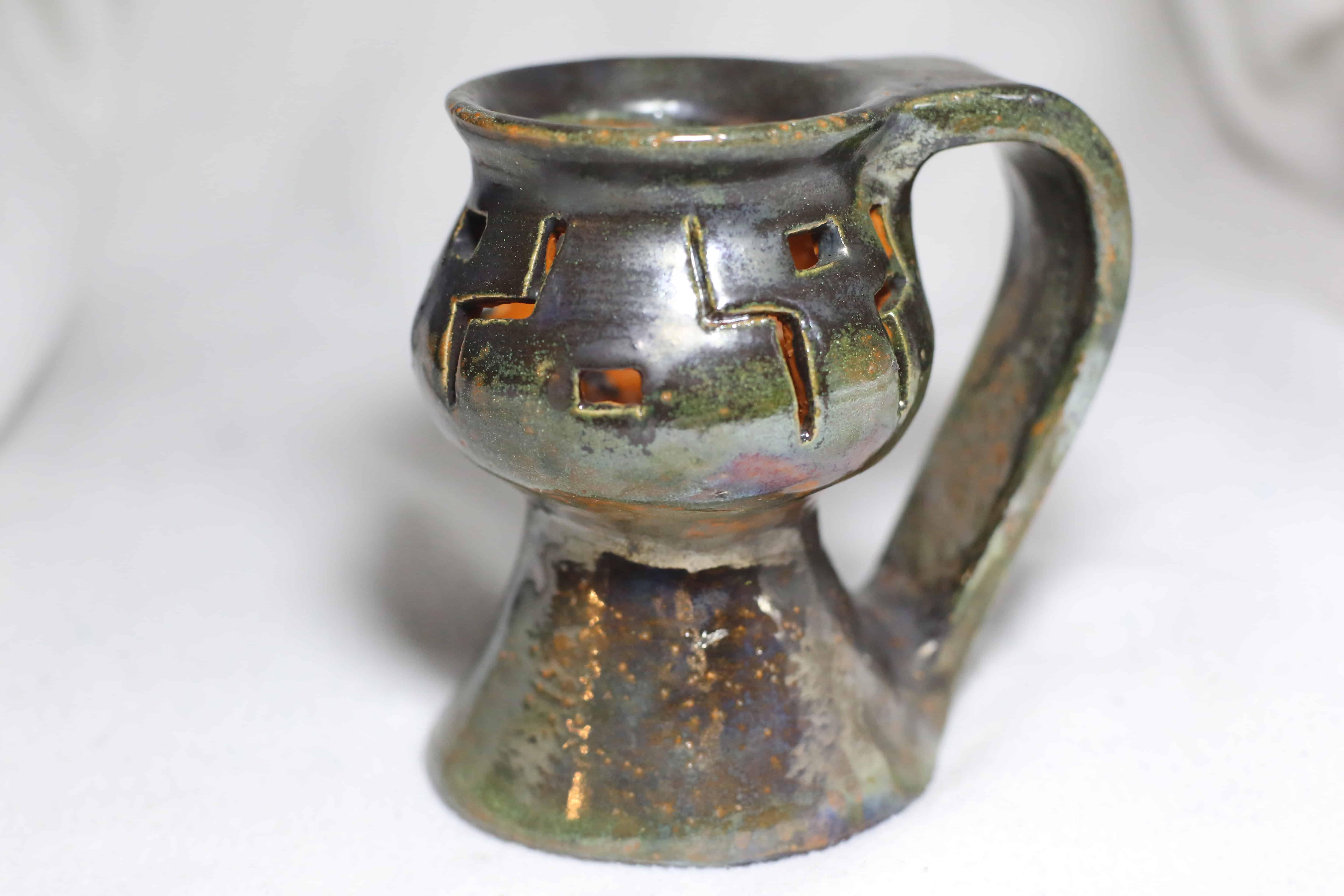 Ceremonial Copal Incense Burner Handpainted-Pottery .  This is one of kind piece and is hand sculpted, has a special coloration of red on buff. It has fire clouding painted by the fire in the process, unique piece. This incense burner is hand made out of special red river clay that is perfect for burning incense. The geometric design painted are Purepecha designs containing sea shells, mountains and valleys. The Copal Incense Burner Handpainted-Pottery measures approximately 6 inches  wide by 5.5 inches tall and wide.You will be receiving the exact incense burner vase  in the description.  It weighs apoximatelly 1 pounds, perfect for holding with a durable grip.