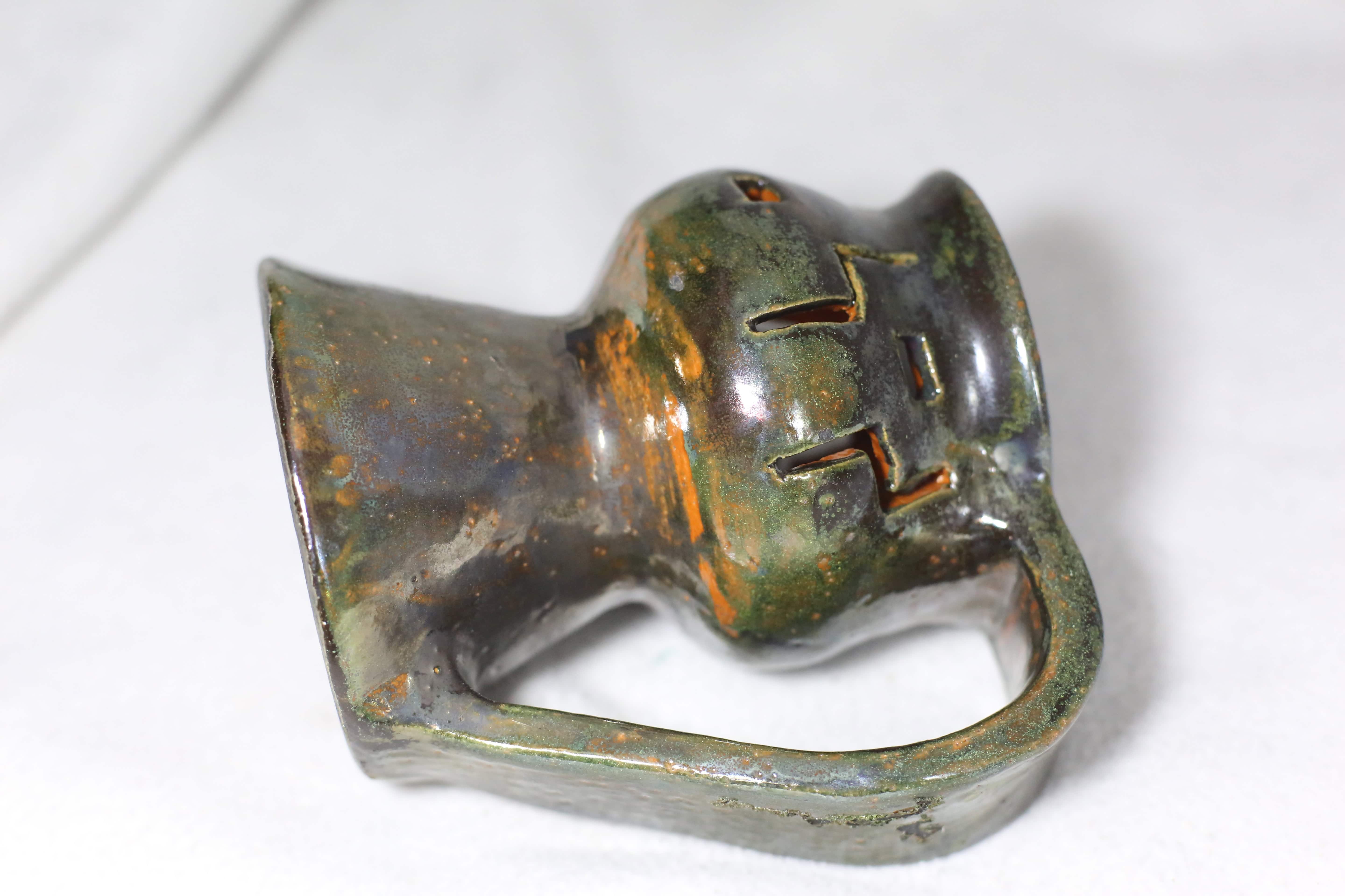 First I collect the clay and hand coil it into the shape of the Copal Incense Burner Handpainted-Pottery then hand paint with natural earth minerals and ochers, this type of pottery is beautiful and is painted by fire glazes are used in the process and none are the same In order to get the feel and result of Ancient North American pottery I use local river clay. I let the piece air dry for at least a week, then I further let them dry outdoor in the Sun. I then pit fire them in my studio. The color of the turtle Ocarina is due to the properties of the clay and fire clouding which means painted by fire. Each piece takes close to twenty days to complete These items are one of a kind artisan piece. This craft is authentic Purepecha First Nations pottery.