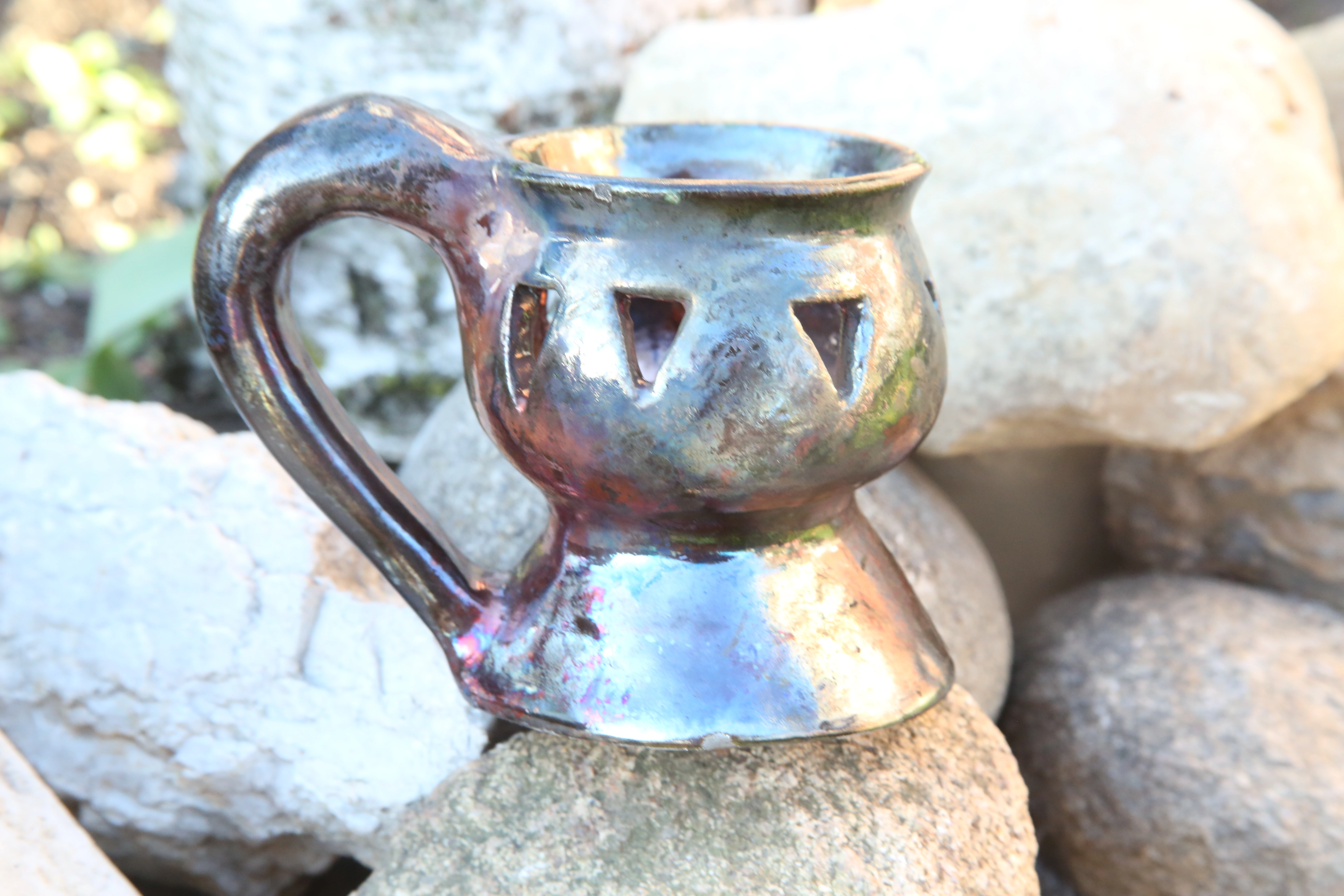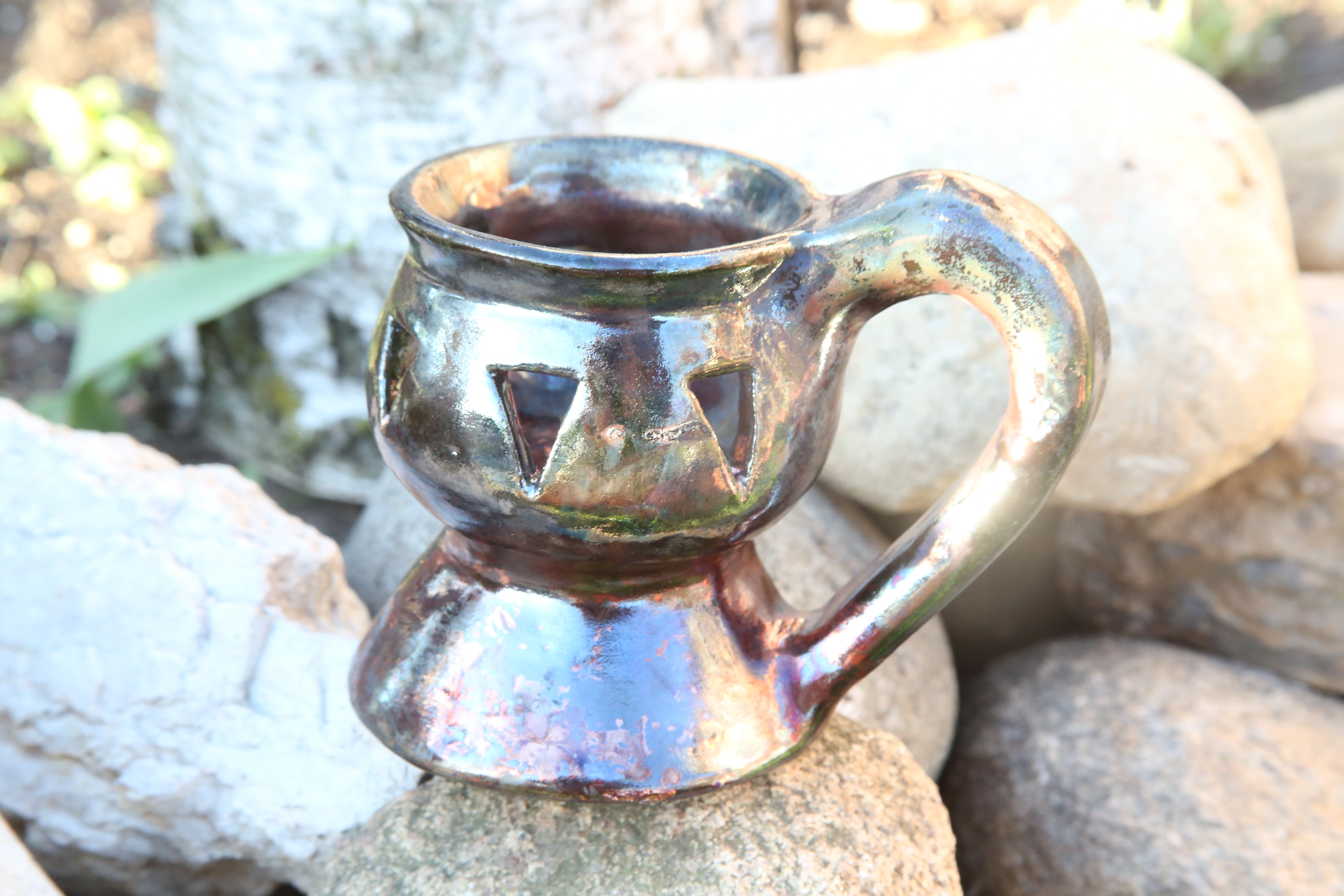 First I collect the clay and hand coil it into the shape of the Copal Incense Burner Handpainted-Pottery then hand paint with natural earth minerals and ochers, this type of pottery is beautiful and is painted by fire glazes are used in the process and none are the same In order to get the feel and result of Ancient North American pottery I use local river clay. I let the piece air dry for at least a week, then I further let them dry outdoor in the Sun. I then pit fire them in my studio. The color of the turtle Ocarina is due to the properties of the clay and fire clouding which means painted by fire. Each piece takes close to twenty days to complete These items are one of a kind artisan piece. This craft is authentic Purepecha First Nations pottery.