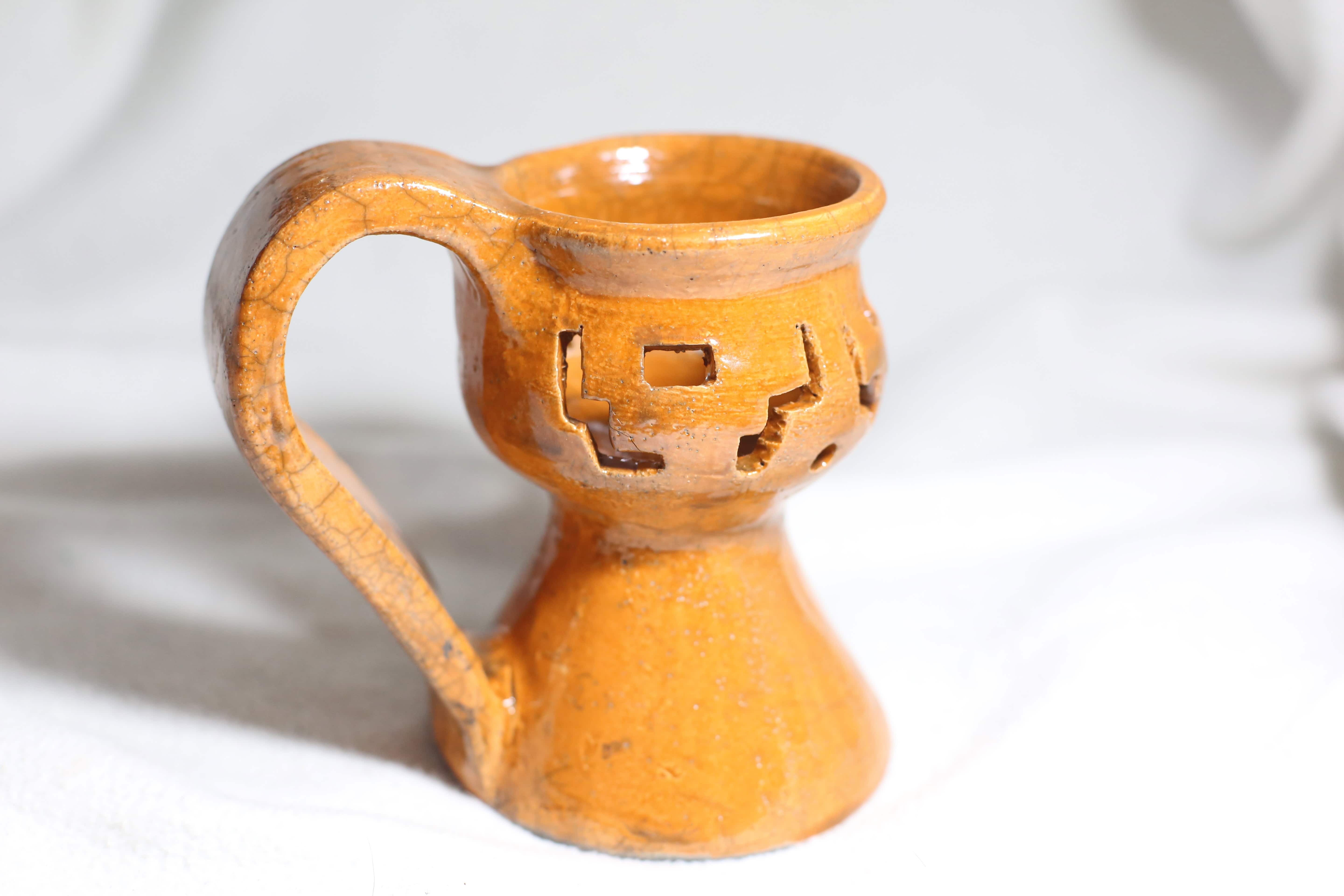 Ceremonial Copal Incense Burner Handpainted-Pottery .  This is one of kind piece and is hand sculpted, has a special coloration of red on buff. It has fire clouding painted by the fire in the process, unique piece. This incense burner is hand made out of special red river clay that is perfect for burning incense. The geometric design painted are Purepecha designs containing sea shells, mountains and valleys. The Copal Incense Burner Handpainted-Pottery measures approximately 6 inches  wide by 5.5 inches tall and wide.You will be receiving the exact incense burner vase  in the description.  It weighs apoximatelly 1 pounds, perfect for holding with a durable grip.